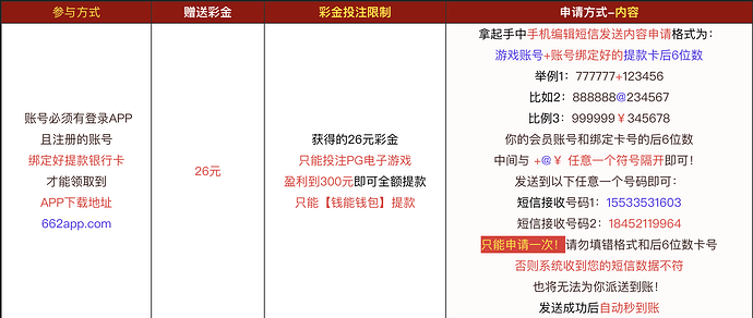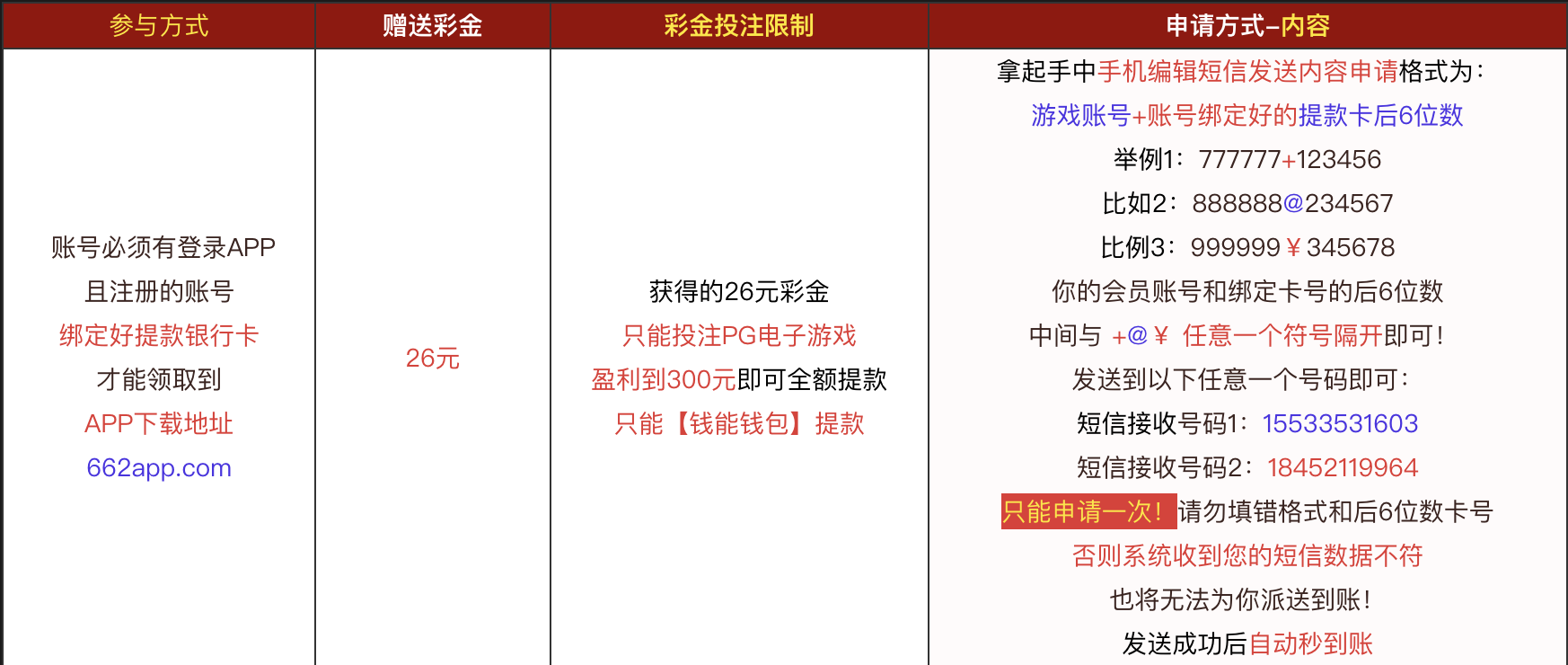 **注意:**投注其他游戏公司有权拒绝派送,发送内容格式一定要正确,不然一个手机号码(会员账号)只能发送申请一次!