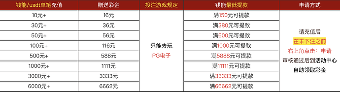 **注意:**此活动不与《首存100%》共享,一笔存款只能申请一项! 每位玩家只能领一次【PG电子以小博大】机会,只能使用钱能钱包或USDT充值!请在未下注前提交申请,彩金到账后才能投注,存款后进行投注则视为放弃,只能投注PG电子,若投注其他游戏将不计算有效投注、扣除彩金及彩金产生的盈利,账号额度低于5元再次存款则不受限制。