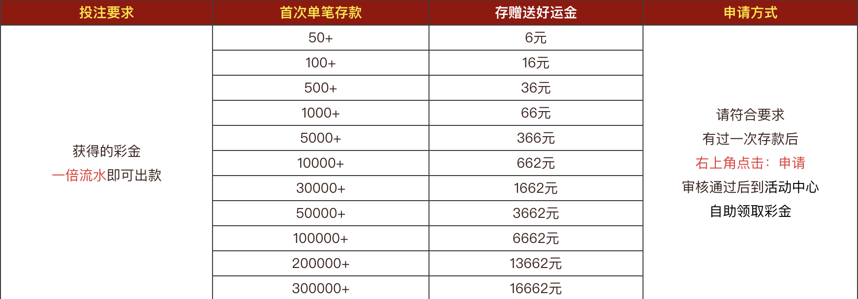 新会员首次单笔存款来玩即送好运金,最高可获得16662元首存红利!每个账号只能提交领取一次,请有存款符合单笔在进行提交!