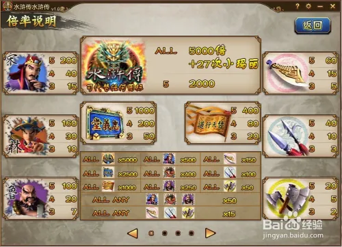 - 1主游戏部分游戏玩法简单,不需要玩家多少操作,并且还有自动游戏的功能。主游戏部分采用独特的机率运算方式,贴近玩家的心理需求。游戏为5轮9线的滚轮类游戏。5轮转动,9条中奖线,同时它还有“水浒传 ”这个万能图案,可以替代游戏里的任意图案,属于百搭图案。