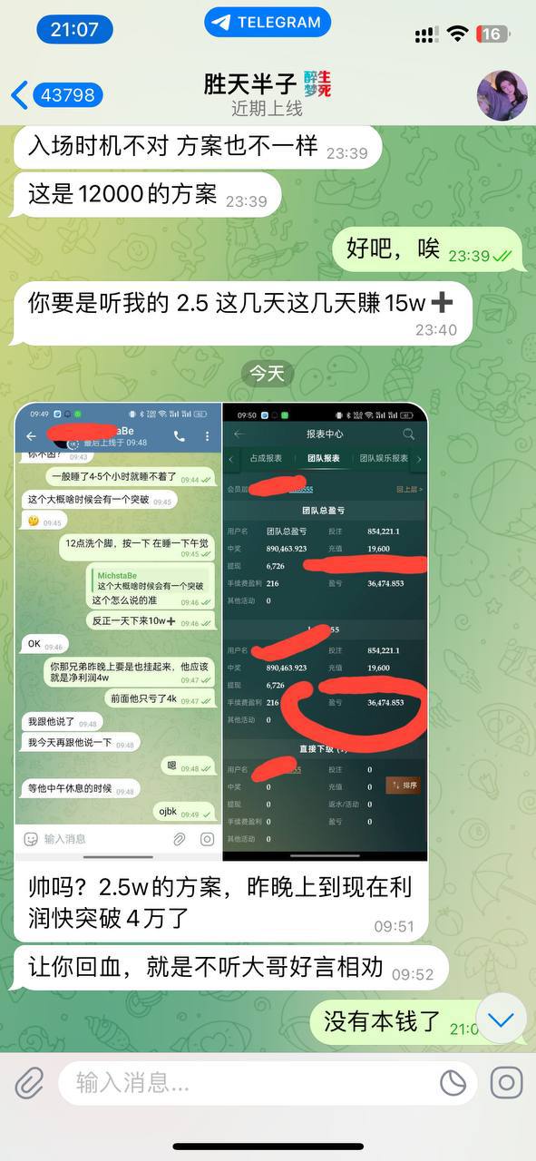 接着,对方忽悠我说:“4000的方案更靠谱。”我心动了,投了4000,结果血本无归。他们又诱导我继续加码:“上1万才是稳赢打法。”我再次相信,却眼睁睁看着资金瞬间清空。