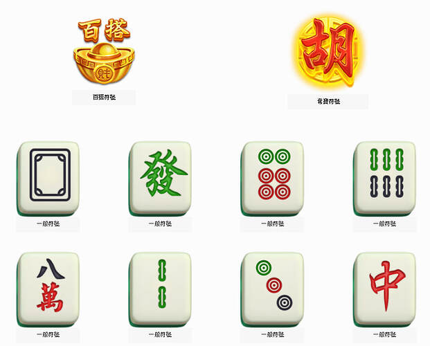 《麻將發了》老虎機中的符號設計基於經典麻將牌,並加入了幾種特殊符號來增加遊戲的娛樂性和贏得大獎的機會。